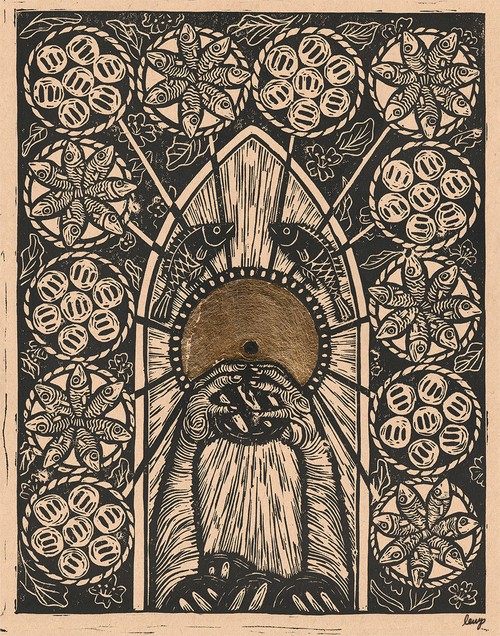 11"x14" hand-carved block printed with oil based ink on paper, with gold leaf detail